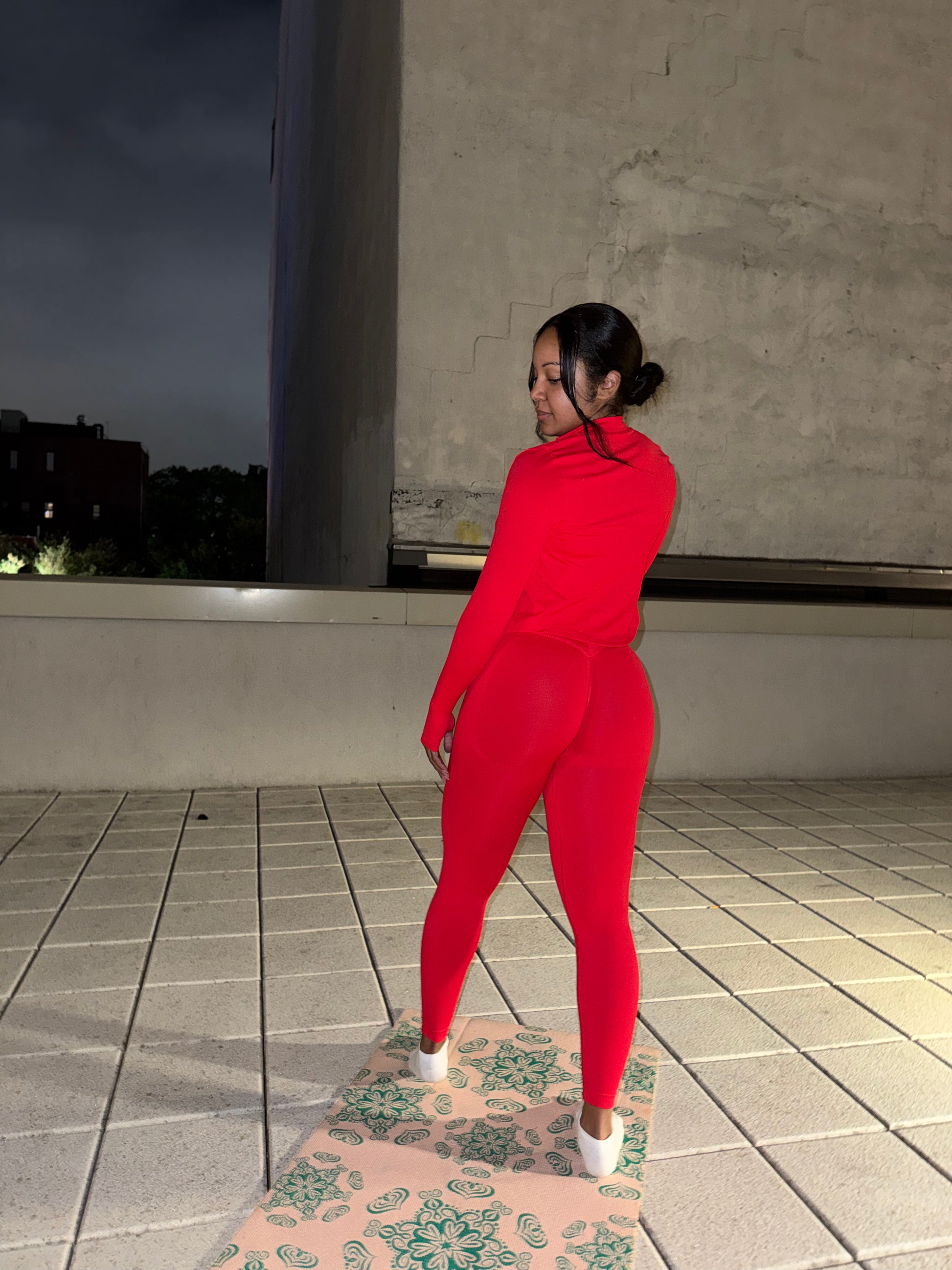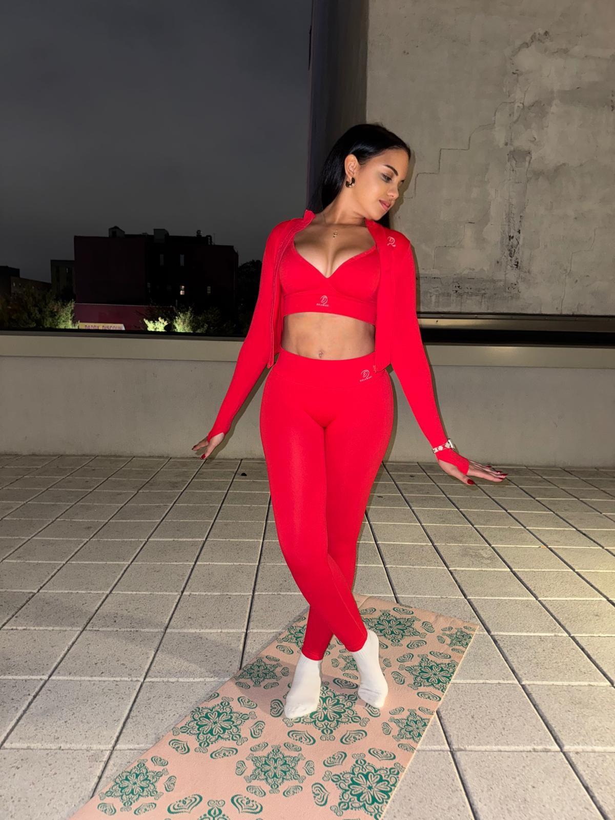 Turn heads with the Villana 3-piece red set, featuring a playful V-cut back on the leggings, bra, and jacket. Designed to mold perfectly in all the right places, this striking set blends bold style with flattering fit for a look that’s both confident and fun.